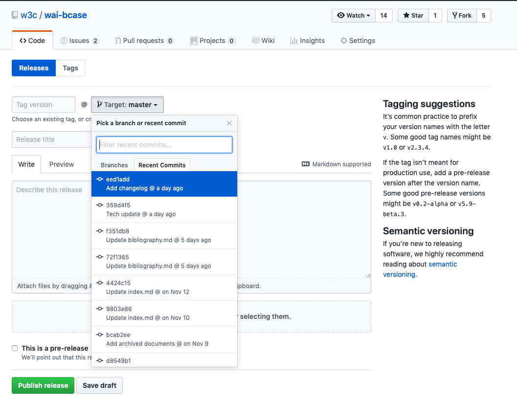 Once changes are implemented and the changelog is updated, create a version tag on GitHub. This version tag is used for the versioning in the changelog file and also to be able and identify versions in the future. For example, we might be working on version 2.6 of a document but there is an issue with 2.5 – we might not want to hold up with the change until the new version is out but to publish 2.6 from the 2.5 branch and move everything we did for 2.6 to 2.7.