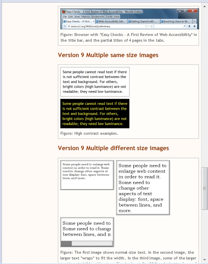 <div class="figure" style="width:712px;"> <img src="page-title.png" alt="Screen shot showing title bar and tabs in FireFox browser. Tabs have: 'Easy Checks - A First...', Web Accessibility Init...', 'Getting Started with...', 'Involving Users in W...'. (FireFox 21.0, Windows)" width="700" height="104" /> <div class="figcaption">Figure: Browser with "Easy Checks - A First Review of Web Accessibility" in the title bar, and the partial titles of 4 pages in the tabs.</div> </div><!--.figure--> <div class="figure" style="width:626px;"> <img src="contrast-b-on-w.png" width="301" height="127" alt="black text on white background" /><img src="contrast-yellow.png" width="301" height="127" alt="yellow text on black background" /> <div class="figcaption">Figure: High contrast examples.</div> </div><!--.figure--> <div class="figure" style="width:628px;"> <img src="resize-normal.png" width="302" height="167" alt=" "><img src="resize-wrap.png" width="302" height="308" alt=" "><img src="resize-scroll.png" width="302" height="167" alt=" "> <div class="figcaption">Figure: The first image shows normal-size text. In the second image, the larger text "wraps" to fit the width. In the third image, some of the larger text is not visible without scrolling horizontally. <em>[@@ make better images]</em></div> </div><!--.figure-->