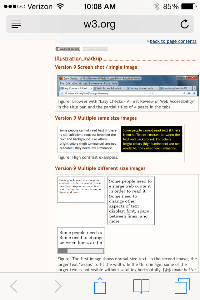 <div class="figure" style="width:712px;"> <img src="page-title.png" alt="Screen shot showing title bar and tabs in FireFox browser. Tabs have: 'Easy Checks - A First...', Web Accessibility Init...', 'Getting Started with...', 'Involving Users in W...'. (FireFox 21.0, Windows)" width="700" height="104" /> <div class="figcaption">Figure: Browser with "Easy Checks - A First Review of Web Accessibility" in the title bar, and the partial titles of 4 pages in the tabs.</div> </div><!--.figure--> <div class="figure" style="width:626px;"> <img src="contrast-b-on-w.png" width="301" height="127" alt="black text on white background" /><img src="contrast-yellow.png" width="301" height="127" alt="yellow text on black background" /> <div class="figcaption">Figure: High contrast examples.</div> </div><!--.figure--> <div class="figure" style="width:735px;"> <img src="/WAI/images/easychecks/resize-normal.png" width="233" height="129" alt=" "><img src="/WAI/images/easychecks/resize-wrap.png" width="233" height="237" alt=" "><img src="/WAI/images/easychecks/resize-scroll.png" width="233" height="129" alt=" "> <div class="figcaption">Figure: The first image shows normal-size text. In the second image, the larger text "wraps" to fit the width. In the third image, some of the larger text is not visible without scrolling horizontally. <em>[@@ make better images]</em></div> </div><!--.figure-->