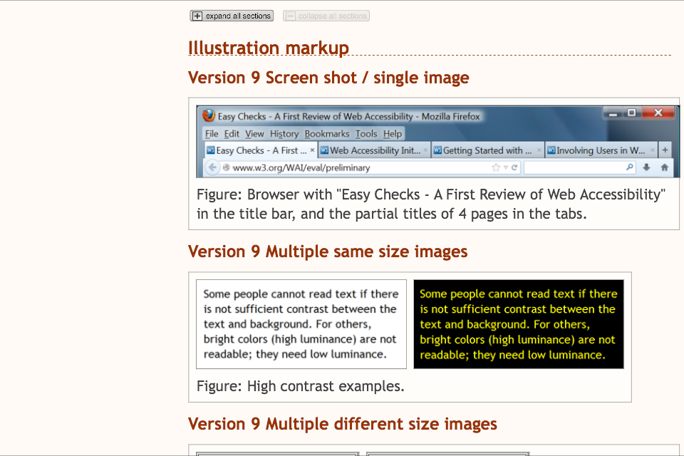 <div class="figure" style="width:702px;"> <img src="page-title.png" alt="Screen shot showing title bar and tabs in FireFox browser. Tabs have: 'Easy Checks - A First...', Web Accessibility Init...', 'Getting Started with...', 'Involving Users in W...'. (FireFox 21.0, Windows)" width="700" height="104" /> <div class="figcaption">Figure: Browser with "Easy Checks - A First Review of Web Accessibility" in the title bar, and the partial titles of 4 pages in the tabs.</div> </div><!--.figure--> <div class="figure multimg" style="width:626px;"> <img src="contrast-b-on-w.png" width="301" height="127" alt="black text on white background" /><img src="contrast-yellow.png" width="301" height="127" alt="yellow text on black background" /> <div class="figcaption">Figure: High contrast examples.</div> </div><!--.figure-->