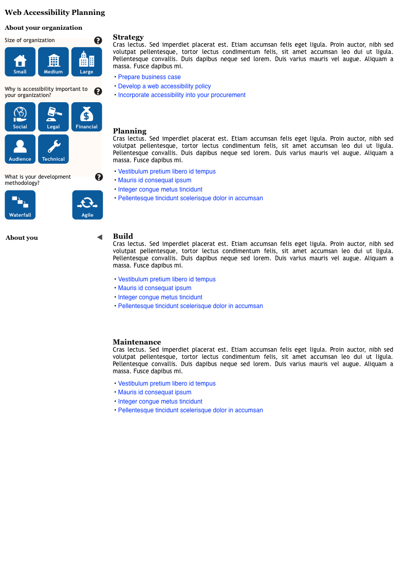 Complete tool: Questions become filters presented to allow users to reduce the information presented to that which is of interest. That than group by topic, group by general project stage.