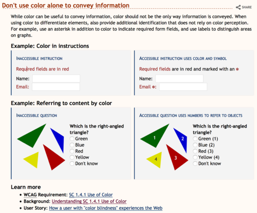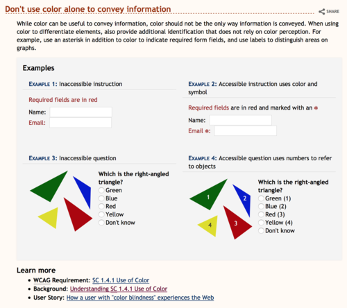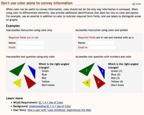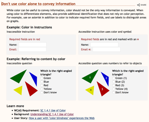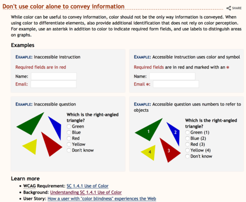 - bad examples — I think it's not clear enough that some examples are BAD examples that you should NOT do, for example, under Make link text meaningful. Even if the caption kinda tells you it's bad, I think it would be good to have a clearer indication; for example, a red X before the bad caption and a green checkmark before the good caption. (although I wouldn't want them to be too attention-grabbing, so maybe pale colors and small :-) [medium] {Shawn}