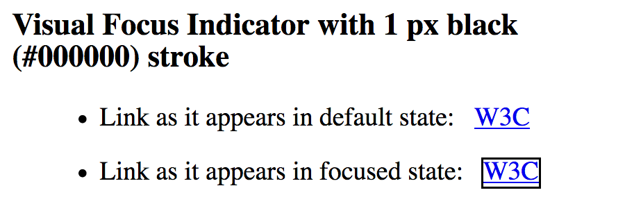 Visual focus indicator for a link that is a 1 CSS px black outline around the link. The 1 CSS px black outline provides sufficient contrast greater than 4.5 to 1. 1 CSS px black visual focus indicator line (#000000) against the adjacent color of white (#FFFFFF) has a contrast ratio of 21 to 1.