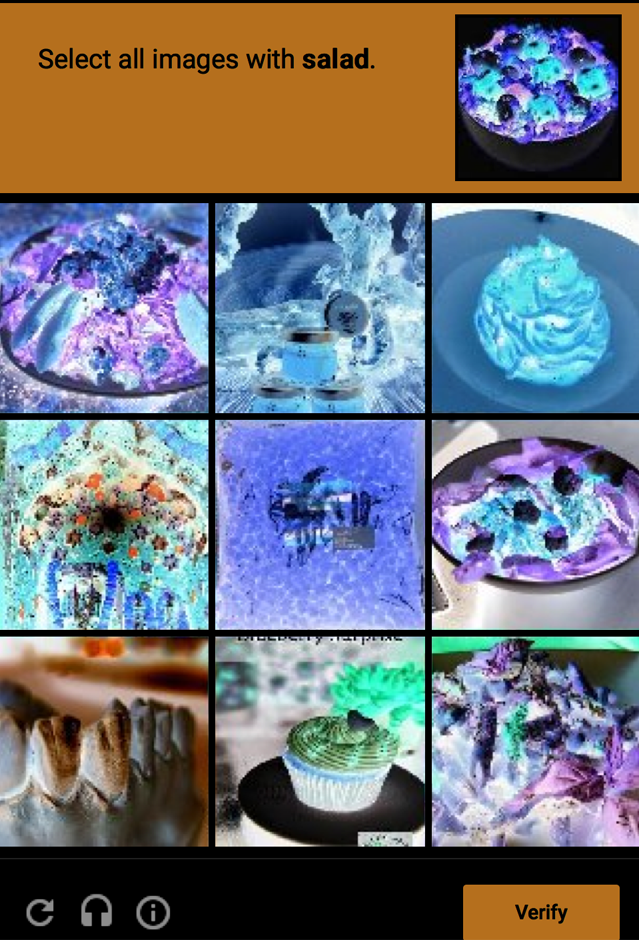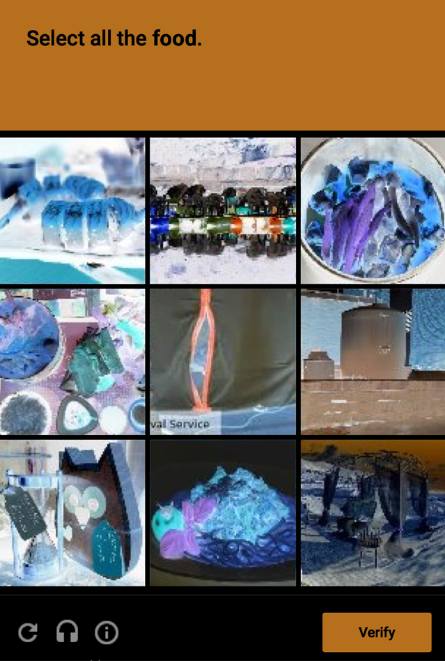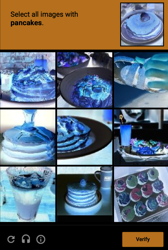 - DESCRIPTION: Susan, wants to write a research paper and use a scholar service to alert her of new information. When attempting to sign up she is initially presented with a check box, which says "I'm not a bot". She checks the box. Then she is presented with a modal dialog, which states "Select all images with street name signs" along with nine photographs (street sign screen capture #1 (.png file)). She has difficulty in identifying the images so she selects the "audio challenge" icon. Rather than being presented with an audio challenge another group of photos appear with the same instruction, "Select all images with street name signs" (street sign screen capture #2 (.png file)). She has difficulty but tries to identify them and selects the "Verify" button. She then is presented with another modal dialog, which says "Select all the food" (food screen capture (.png file)). A 2nd time she selects the "audio challenge" icon but is not presented with an audio challenge. She is presented with a modal dialog, which says "Select all the images with salad" along with a group of photos (salad screen capture (.png file)). Again, she tries unsuccessfully. A 3rd time she selects the "audio challenge" icon but is not presented with an audio challenge. This time she is presented with a modal dialog, which says "Select all the pancakes" along with a group of photos (pancakes screen capture (.png file)). Again, she tries unsuccessfully to complete the task. This process is repeated unsuccessfully several more times with various other sets of images. Finally, an error dialog box appears (error screen capture (.png file)). This experience results in fatigue, frustration, being unable to sign up for the Web service independently, and ultimately having to ask for assistance from another person.