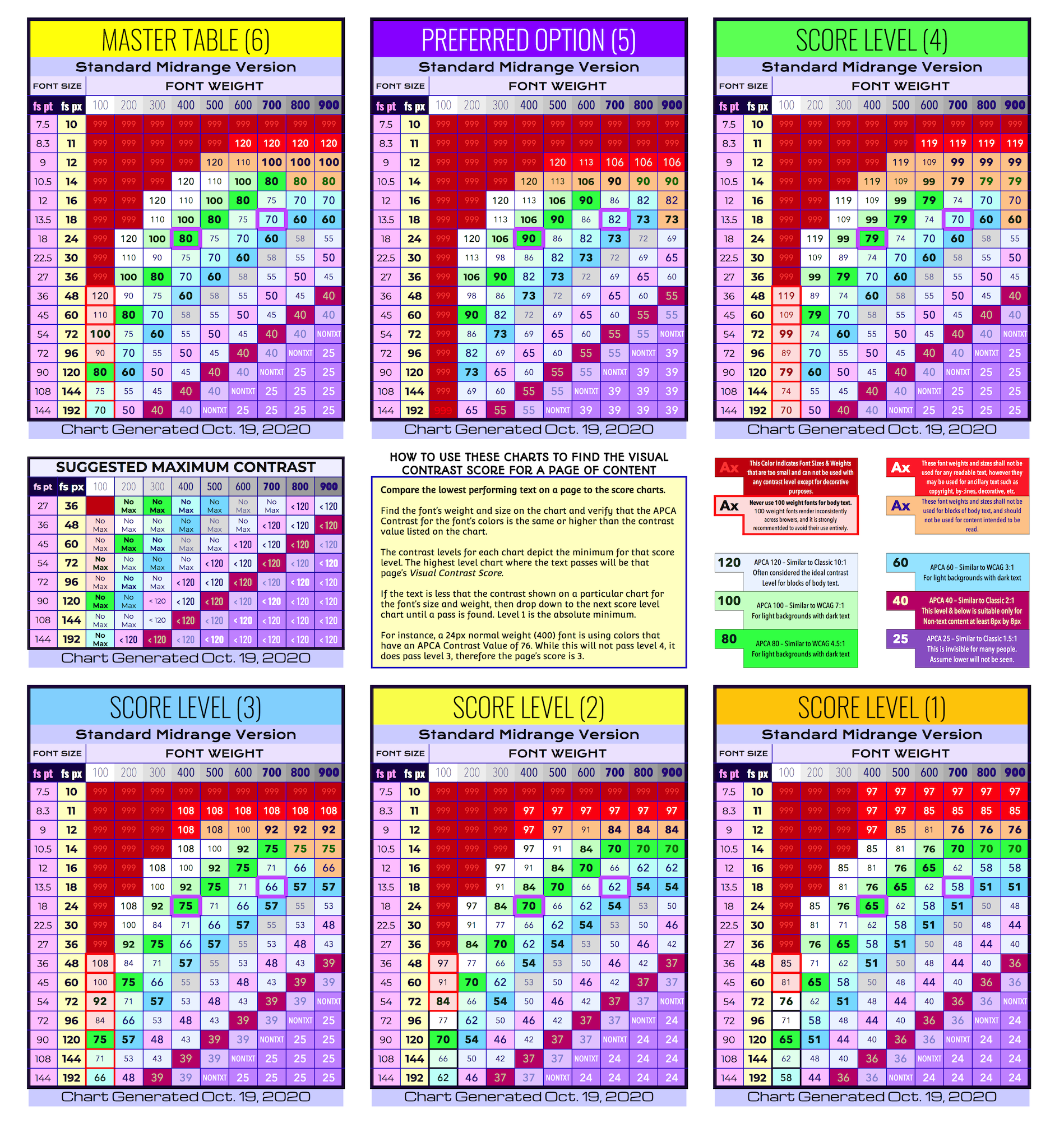 | current | 01:14, 20 October 2020 | 1,898 × 2,018 (2.01 MB) | Myndex (talk | contribs) | A set of charts for each level of Visual Contrast. |