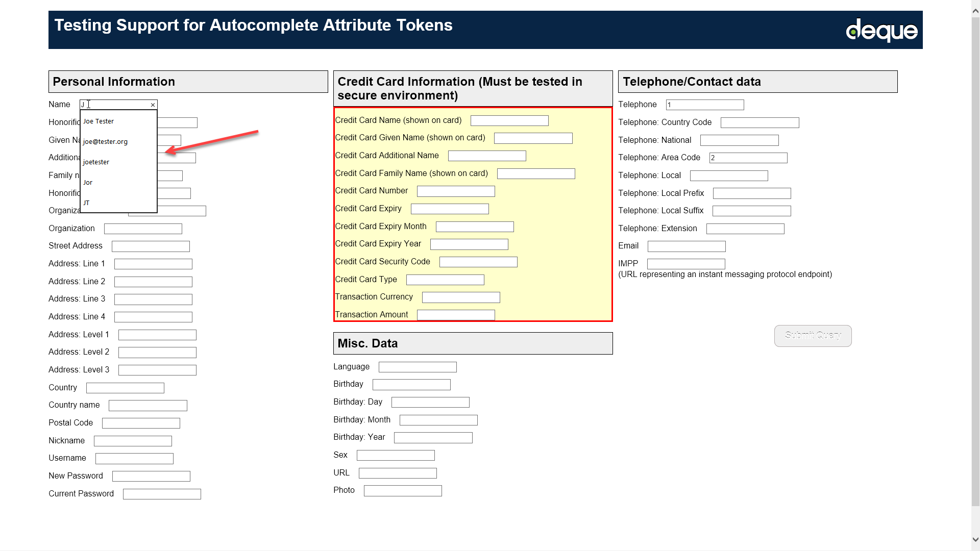 Screen capture of test file located at http://john.foliot.ca/demos/autofill.html demonstrating native browser support
