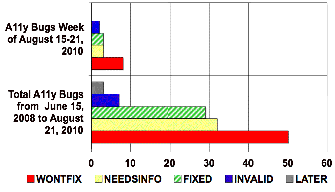 Bug Comparison Chart. It compares the number of A11y bugs for the week of August 15-21, 2010 to the total number a11y bugs from June 15, 2008 to August 21, 2010 in five different categories. The five bug categories are WONTFIX, NEEDSINF0, FIXED, INVALID, and LATER.
