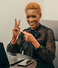 - Il est généralement préférable que les couleurs de l’arrière-plan et des vêtements de l’interprète en langue des signes soient des couleurs unies qui contrastent avec leur couleur de peau. De cette manière, leurs mains et leur visage sont faciles à voir.