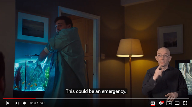 Exemple d’interprétation en langue des signes dans une vidéo : Publicité NHS 111 en langue des signes britannique (BSL) (Youtube)