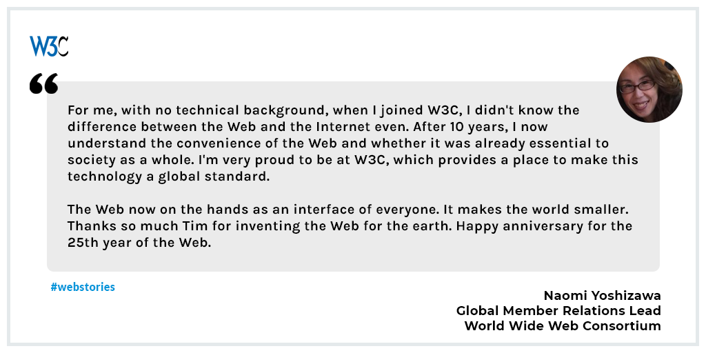 Please use #w3c25 and/or #webstories on social networks to share your story, share photos, screenshots, gifs, or videos - whatever you prefer! If you wish to have your story "card" created, please, send us two or three short paragraphs, your picture, name, title and organization, and we will be happy to add it to the #webstories.
