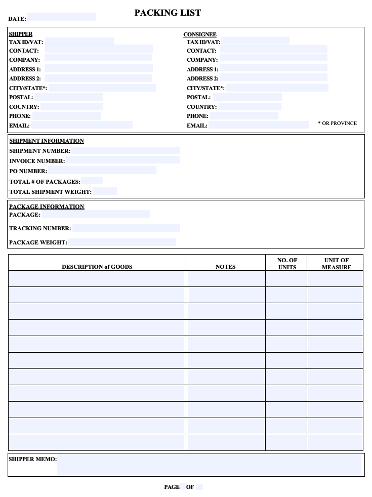 The Packing List lists the goods of a shipment. It is used by the consignee and Customs to practically manage and organize the consgned goods.