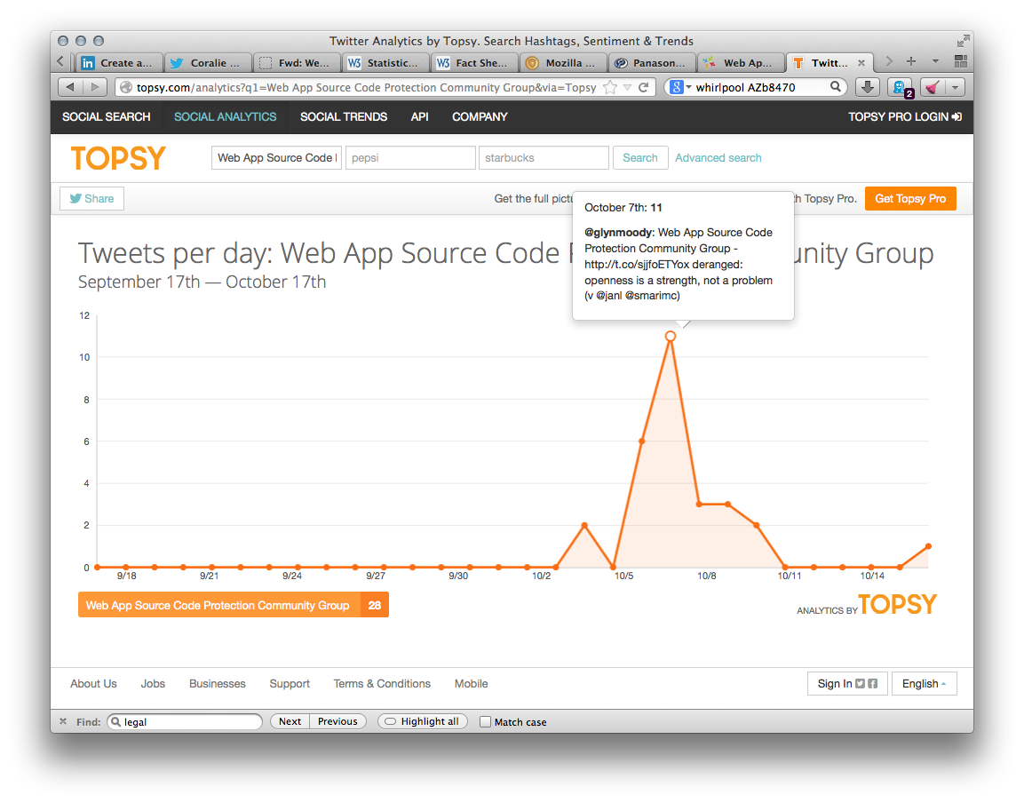 See for example this Topsy graph. It shows the number of tweets per day that mentioned “Web App Source Code Protection Community Group”: