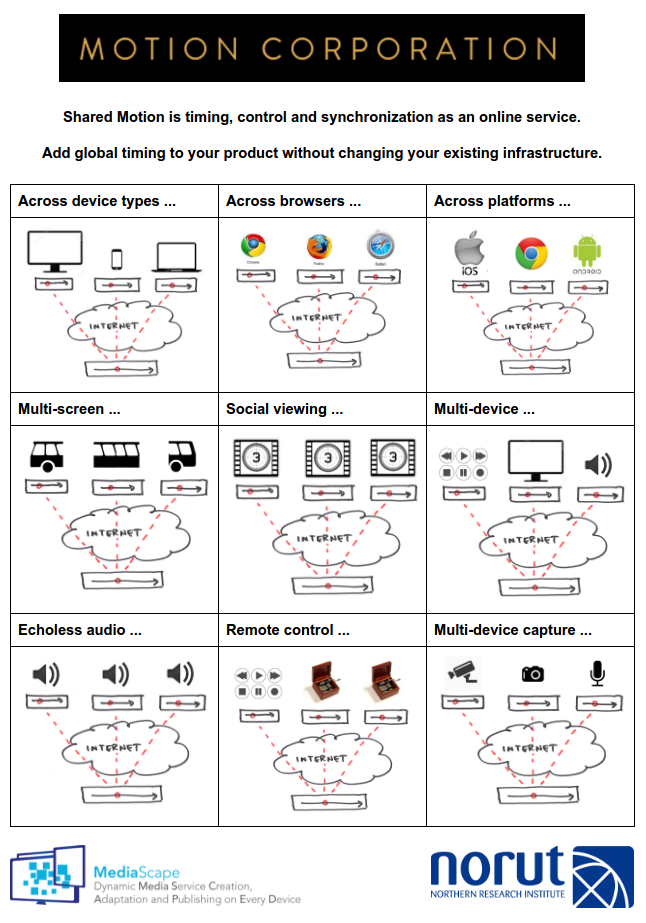 Also, if you are interested in discussing commercial opportunities implied by Web-based timing, you may set up a meet through our American partners, Glen Sakata [6] or Chris Lennon [7] at MediAnswers [8]. They have a long track record within the american broadcasting industry, and a keen understanding of what opportunities the Timing Object & Shared Motion can offer to the industry.