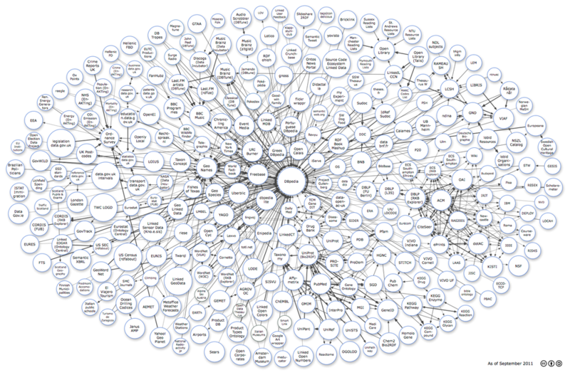 RDF forms the basis for the Web of linked data. This is formed by the collection of servers that host linked data. The number of sites has risen dramatically in the last few years, mirroring the growth of the Web in the 1990's. The following illustration of the Web of linked data is from the The linking open data cloud diagram from September 2011.