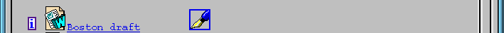 In Figure 1, the member 'trevor' has selected the event-view of the root-folder of the 'Boston paper' workspace. He sees the workspace objects in this folder--in this case, a FrameMaker and a Microsoft Word document, two links to related W3 pages, a sub-folder, the 'members' group and the workspace Wastebasket. To the right of each object, one or more icons may be displayed which signal that events have occurred concerning that object. So in Figure 1, the document 'Boston draft' has been written, while the 'Screendumps' folder has been added to the workspace since 'trevor' last logged in. Other events signalled in this way include 'read', 're-named', 'moved', 'versioned', while a 'deleted' event is signalled by the Wastebasket object becoming 'full', as in Figure 1. Members can cli ck on the event icon to get more information (such as who caused it and when it occurred), and can 'catch-up' events, similar to catching up read articles in a Usenet newsgroup, by clicking the 'Catchup events' button above the workspace listing.