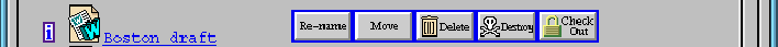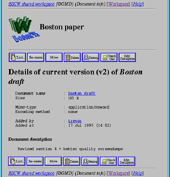 The system provides a simple check-in/check-out facility to assist with version management, using a form of 'soft-locks' to ensure members are aware of the current document status. If a member tries to retrieve a document which is currently checked-out, a notification message is returned showing who has the document, but provides the option for the member to retrieve the document anyway. We are currently working on a more powerful version and locking management system, but believe this basic approach provides at least an awareness of the current activities of group members. In addition to this facility, the system also provides more standard operations associated with document management, such as re-naming, moving and deleting. Following the Macintosh metaphor, deleted workspace objects are stored in the workspace Wastebasket, allowing them to be restored if necessary.