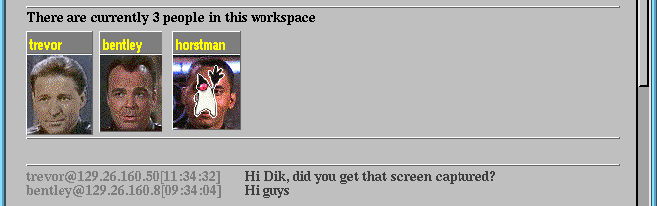 To demonstrate the potential of this approach, we have extended the BSCW system with a simple 'talk facility' implemented using Java Applets (Figure 5). As with Virtual Places, end-users interacting with the same workspace see each others' icons and can type simple messages, click on the icon to 'alert' a user, and establish a simple audio connection. We are currently experimenting with more advanced features such as shared pointers and simple shared editors, and we believe that this approach allows support for more synchronous collaborative information sharing, without compromising the existing W3 architecture. The recent decision of Netscape to license the Java interpreter for their own W3 clients makes this approach more realistic, and the benefits will become more apparent as richer interface toolkits and class libraries become available.