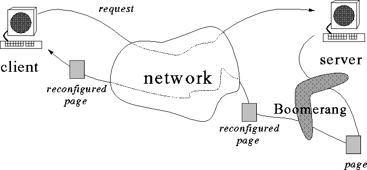 Boomerang is an ``intermediary'' or ``wrapper'' script that sits between the browser and the server. When using Boomerang, a user has the same basic browsing behaviour. However, when fetching new pages Boomerang serves as an intermediary agent between the user and a desired page as shown in Figure 2. Instead of directly requesting a new page, the user activates a link that starts Boomerang and instructs it to fetch the desired page. The user also tells Boomerang how to reconfigure the page. Boomerang ``intercepts'' the page fetch request, fetches the requested page, and reconfigures it according to user specification.