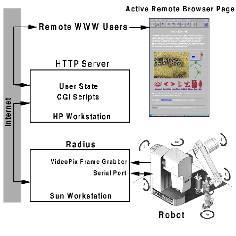 The restrictions imposed by the Hyper Text Markup Language (HTML) made it difficult to design an intuitive user interface to a complex 6 axis robotic system. Certainly, we could have chosen to construct custom navigation software for users to download. While this would allow us more freedom in the design of the overall system, it would severely restrict the accessibility of the browser. Since we consider the quantity and diversity of users on the WWW as one of its most powerful aspects, we choose to constrain the development of our system within the accessibility of WWW users.