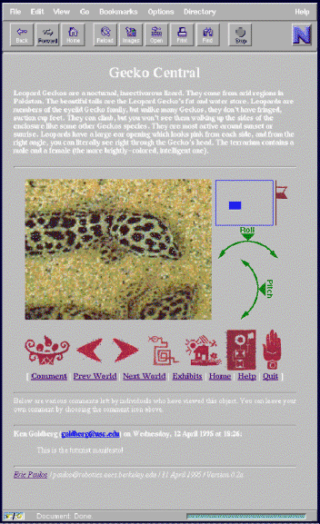 In addition, each exhibit has a hypertext page with links to texts describing the object, other WWW pages relevant to it, and to comments left by other users. These pages can be accessed by navigating the camera in a physical space, and centering on a particular object. The pages can be thought of as mark-ups of 3D objects in the spirit of VRML [2] [3] [4], but where the objects are actual physical entities in a remote space rather than simply models.