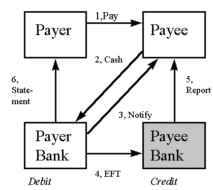 In Figure 5 above, the payer receives a bill/invoice from his bank, (assuming electronic bill presentment allows for capture of the payee's bills by the payer's bank), issues an Electronic Check, an sends it to his bank. The payer's bank, in turn, transfers funds to the payee's account at the payee's bank.
