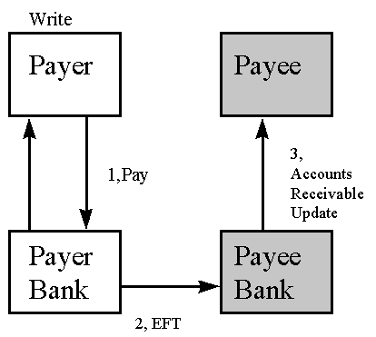 In Figure 3 above, the payer receives a bill/invoice from payee, issues an Electronic Check, and sends it to the payee. The payee presents it directly to the payer's bank to be paid to the payee's account at his bank.