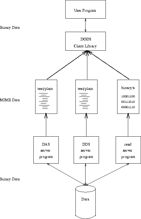 All information sent from the server programs to the client library is enclosed in a MIME document. Two of the three programs return information about the variables contained in the data set as text/plain MIME documents. These documents can then be parsed by software in the client library. In addition, these text documents can be read by any software that can process ASCII text. Thus, the responses made by the server are specifically suited to use by the DODS client libraries, they can also be used by many more general programs. For example, it is possible the use a general purpose World Wide Web browser to `read' these documents.