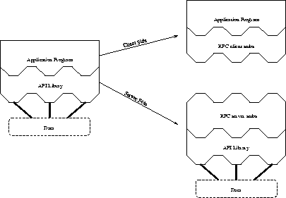 Once a client library has been constructed for a given API, it is possible to re-link many user programs written for the API with this new library. If the API hides the storage format of the data being accessed and the program uses the API correctly (i.e., without taking advantage of any undocumented features present in the original version but not present in the new client-library version), then the program will require no modification to work with the new implementation of the API. A program thus re-linked can read data from any machine so long as that machine has installed a matching data server. Because the same API has been used by many programs, re-implementing it so that it reads information over the network facilitates the transformation of each program into a client capable of accessing data provided by any suitable server on the network.