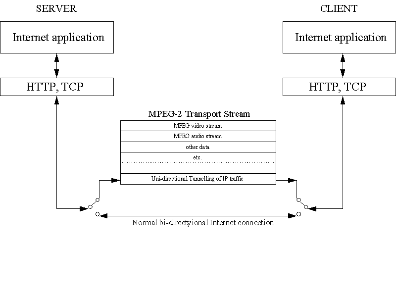 Meanwhile both Internet and Digital TV technologies are evolving further. On Internet, transmission of real time media is getting supported, using the Internet Protocols. For Digital TV services, methods for data transmission are defined; these methods are largely based on MPEG-2 technology. These methods will be used to enhance the more traditional television services by interactive applications. Another use of these methods is tunnelling of Internet data. High bandwidth uni-directional gateways for IP traffic are expected to become available in MPEG based channels that can also be used for Digital TV services; see figure 1. This scenario is specifically attractive in cable network systems.