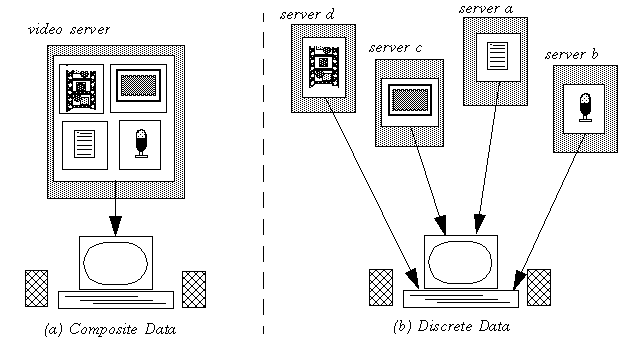 Solutions to the problem of supporting such a video depend on how one chooses to view the problem. Fig. 1 shows two such views: the composite data view and the discrete data view. In the composite data view, all of the component media types are encoded as a single media stream; presenting the video means accessing the video server that contains the video file, transporting that file across the network, and displaying it locally. This task is not trivial, but it is well understood: depending on the characteristics of the server, of the network and of the (local) presentation host, we can easily determine if the video can be presented by controlling a single data stream. (In effect, this approach is no different than that used to display an image inside an HTML document now albeit a pretty complex image!)