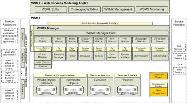WSMX is a Service Oriented Architecture (SOA), which means that it is a software system consisting of a set of collaborating software components with well-defined interfaces that together perform a task. These components do not necessarily execute in the same address space, and not even necessarily in different address spaces on the same machine. Instead, they may very well execute on different network locations communicating over a network connection through multiple protocol stacks. This situation creates its own unique demands, born out of latency, memory access, concurrency and failure of subsystems, which the architecture must be able to cope with. All these aspects are addressed in subsequent phases during designing and implementing WSMX. SOAs differentiate themselves from other distributed systems through the concept of loose coupling brought to its extremes. Strong decoupling of the various components that realize an e-commerce application is one of the major features of WSMO. In WSMX, conceptually independent pieces of functionality have been grouped in components. Each of the WSMX components provides services – each of which is a logical unit of system code, application code, and persistency layers — in short, anything that as a unit can carry out an operation. Services are often characterized by exactly these operations that they provide to other components. Preferably services have descriptions in machine-processable meta-data. Although it is recommended to build the communication inside a Semantic Web services architecture on the event paradigm, the system components can be coordinated without events. In distributed SOA systems, communication between components can take place through events. It enables the best practice of implementation abstraction through interfaces, by which the implementation of a service must be of no concern to the client of the service. All of this together results in increased flexibility, better extensibility and dramatically improved reusability. However, it is not always easy to achieve all of these goals simultaneously, even if the right architectural decisions are taken. Scalability and proper service structuring are crucial and have to be taken into account as well.