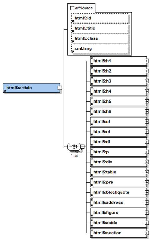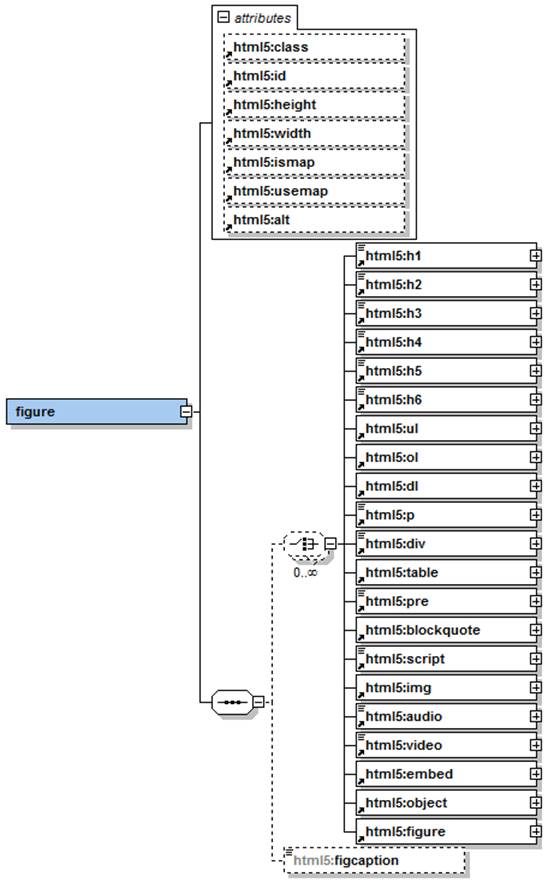 In this Specification, the recommended HTML5-based PSV XML model is illustrated using model diagrams produced with the XML Spy software product. These diagrams show the PSV element and attribute structure. The legend for reading XML model diagrams is shown in Figure 1.2. Elements that are required by the model are shown in a solid box. Elements that are optional are shown in a dotted box. Likewise attributes may be required (solid box) or optional (dotted box). A repeatable occurrence of elements is indicated by numbers below each element box to the right.