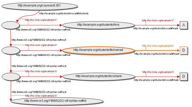 <http://example.org/courses/6.001> s:students _:a <- http://ns.inria.org/example1/ _:a rdf:first _:d <- http://ns.inria.org/example1/ _:a rdf:rest _:b <- http://ns.inria.org/example1/ _:d s:mark "A" <- http://ns.inria.org/example1/ _:b rdf:first _:e <- http://ns.inria.org/example1/ _:b rdf:rest _:c <- http://ns.inria.org/example1/ _:f s:mark "B" <- http://ns.inria.org/example2/ _:c rdf:first _:g <- http://ns.inria.org/example1/ _:c rdf:rest rdf:nill <- http://ns.inria.org/example1/ _:g s:mark "B" <- http://ns.inria.org/example1/