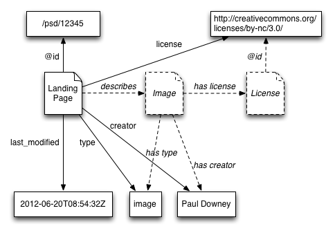 both the creator and the license properties are shorthand properties of the image described by the landing page at the entity URL http://photo.example.com/psd/12345. However, the value of the creator property is also a landing page, this time for Paul Downey, whereas the value of the license property actually points to the content of the licence.