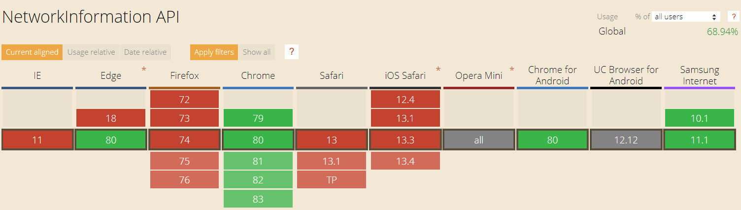 Screenshot of Network Information API adoption in browsers as documented on canIUse.com