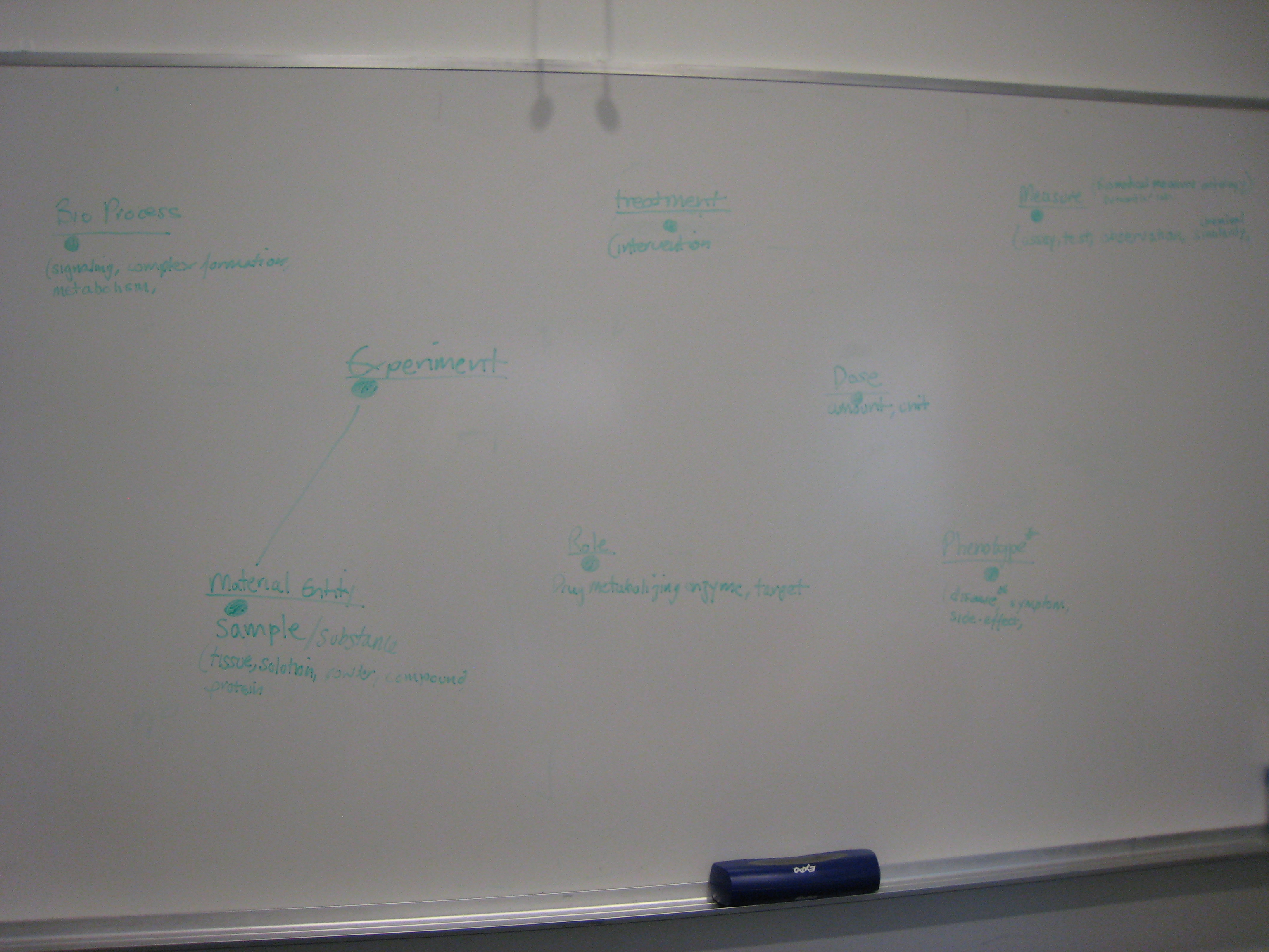 - Goals: discuss content for the ICBO poster, identify classes and predicates in the template ontology, and if time permits start to define use cases