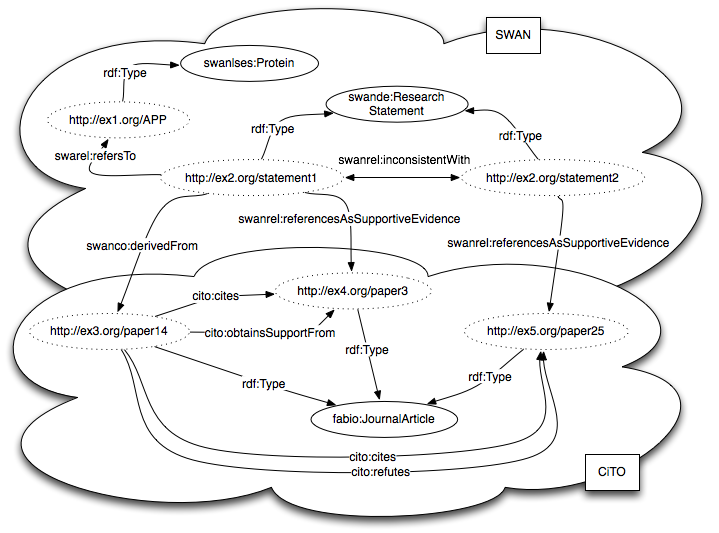After analyzing the scope of the two ontologies target of the integration/alignment process, it became clear that CiTO should be used specifically for literature citations while SWAN should be used for hypothesis and scientific discourse more generally.