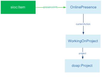 I talked with Uldis about this, and he suggested having flattened properties in addition to the presenceInfo property to bypass the indirection introduced by the OnlinePresence concept (although this indirection provides certain flexibility and is good for the possibility of appearance of new actions/elements of context). For the WorkingOnProject case the flattened property would look like shown on the picture: