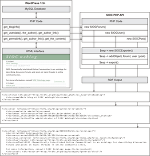 The export process is illustrated by example in Figure 1. It shows the export process as implemented in a new version of WordPress SIOC plugin (in development) using a SIOC API for PHP.