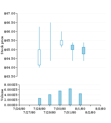 A visualization with two related charts that share an x axis (date) and show two aspects of stock trading. The upper chart shows the trading range and the lower chart shows the volume traded.